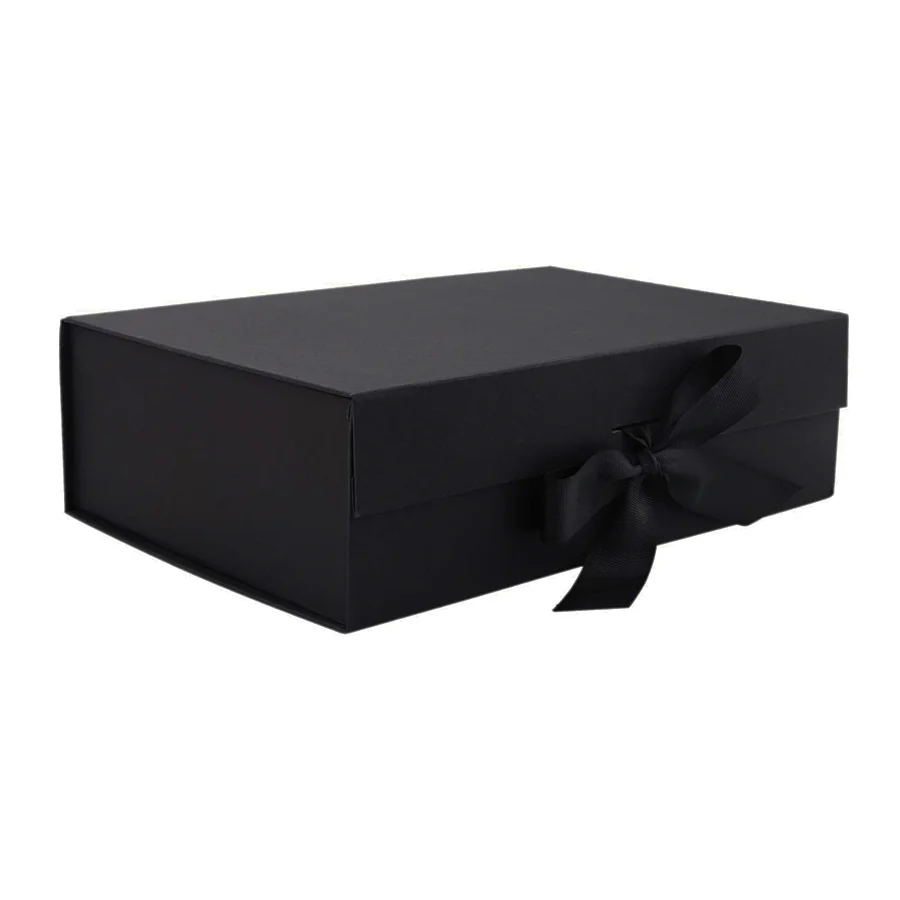 Caixa rígida dobrável na cor preta, com fita inclusa, para presentear com praticidade e elegância. Design Dobrável Inteligente: caixa de presente projetada para ser dobrável, o que a torna extremamente fácil de armazenar quando não está em uso. Fácil de montar! Fita de cetim inclusa.