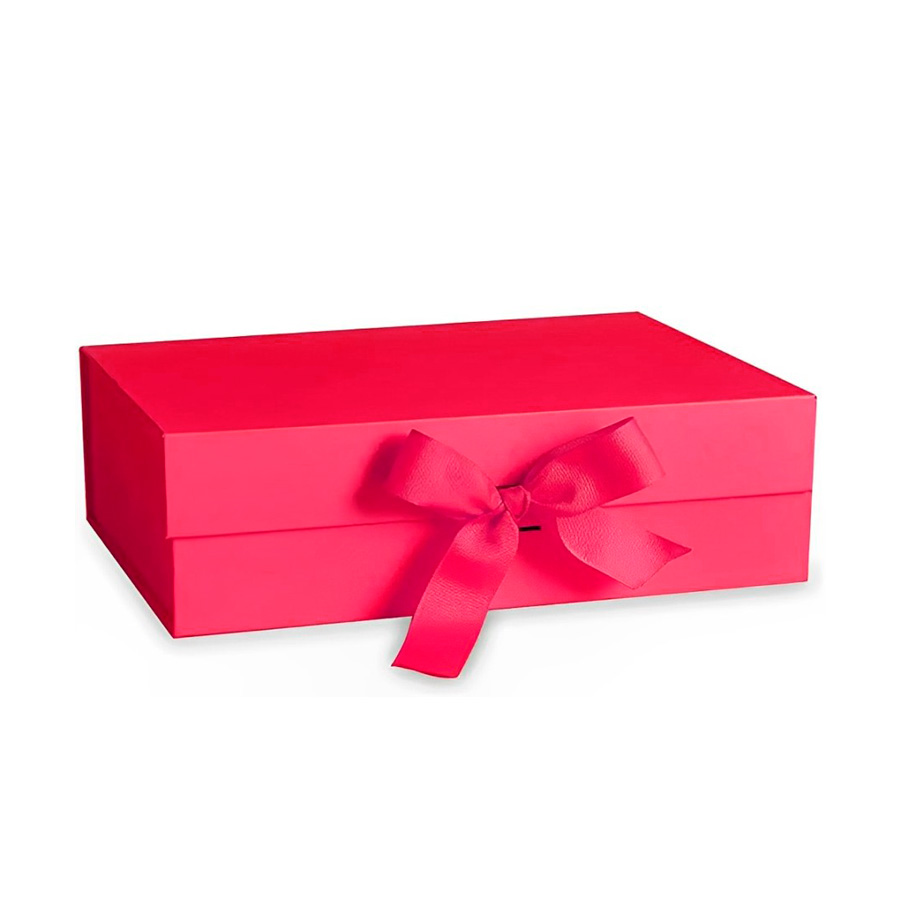 Caixa rígida dobrável na cor rosa, com fita inclusa, para presentear com praticidade e elegância.