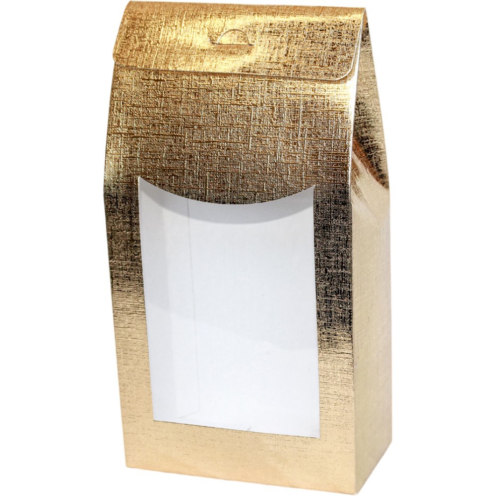 Caixa Sacolinha com Visor P (7,5cm x 19m x 6cm) Dourada 10 unidades Assk Rizzo Embalagens