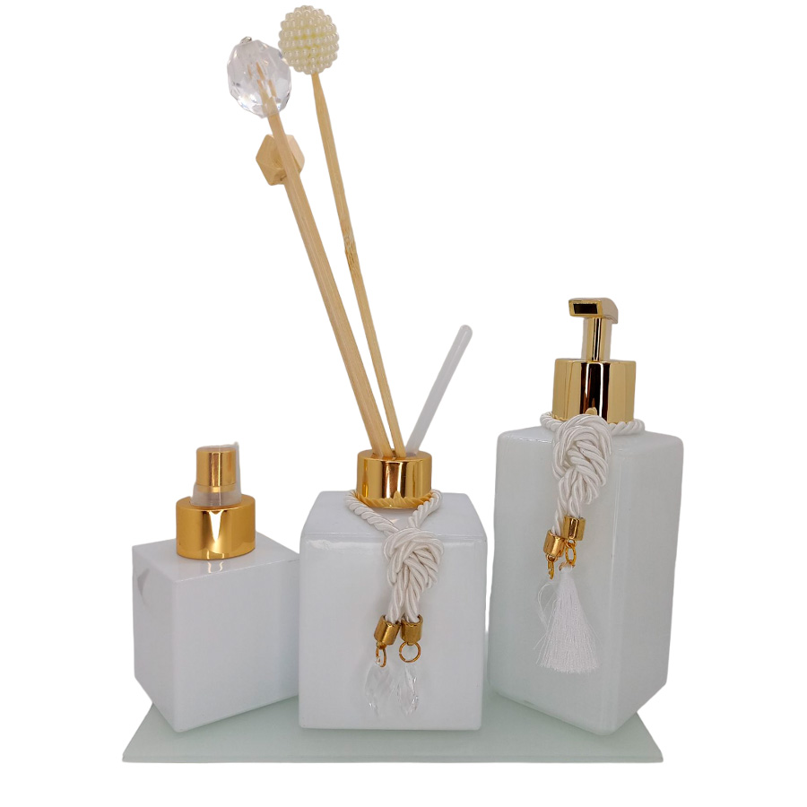Apresentando o deslumbrante Kit Frascos para Aromatizador de Vidro Quadrado/Retangular e Bandeja de Vidro! Este conjunto exclusivo é a escolha perfeita para adicionar um toque de sofisticação à sua decoração de banheiro ou mesa da sala de estar. Composto por três frascos de vidro brancos, sendo dois deles quadrados e um retangular, este kit é perfeito para armazenar perfumes ou líquidos de escolha própria. Os tons claros do vidro branco proporcionam um ar de leveza e requinte, enquanto as tampas douradas conferem um toque de luxo e elegância. Cada frasco é meticulosamente trabalhado para garantir qualidade e durabilidade, além de possuir o tamanho ideal para armazenar seus aromatizadores favoritos. O design versátil permite que você crie arranjos únicos e personalizados, tornando seu banheiro ou sala de estar ainda mais aconchegante e convidativo. E não para por aí! O kit inclui uma base de vidro perfeitamente polida, proporcionando uma plataforma estável e deslumbrante para exibir seus frascos de forma impecável. Adquira agora mesmo o nosso Kit Frascos para Aromatizador de Vidro Quadrado/Retangular e Bandeja de Vidro e transforme o ambiente com um toque de classe e beleza. Surpreenda-se e encante-se com essa adição refinada à sua decoração! Não perca essa oportunidade de tornar o seu espaço único e cativante.