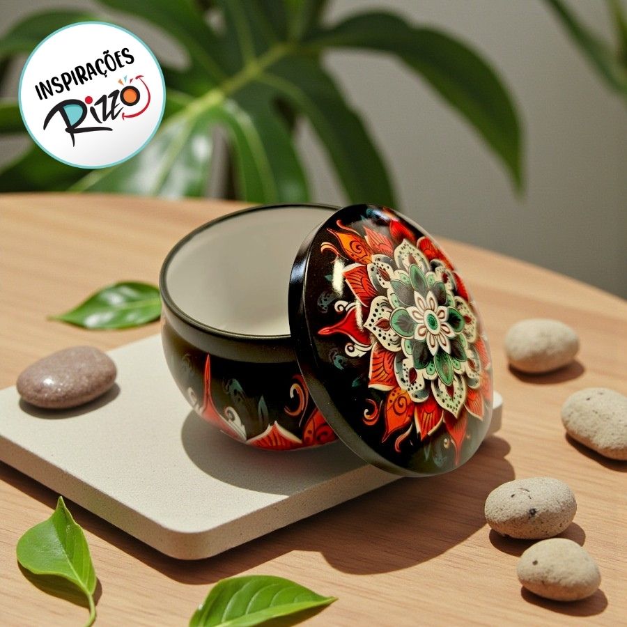 A Lata de Metal Estampa de Mandala Preto e Vermelho é uma embalagem decorativa e reutilizável, com capacidade de 130ml e tamanho de 7x7x4cm. Ideal para lembrancinhas, presentes e organização, destacando-se pelo acabamento metálico e estampa contrastante.