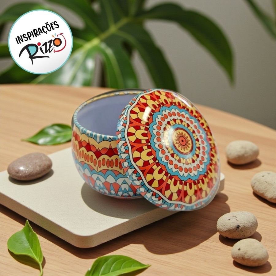 A Lata de Metal com Estampa de Mandala nas cores vermelho e azul é uma embalagem decorativa moderna e cheia de personalidade, ideal para valorizar lembrancinhas, presentes e kits especiais. Seu design inspirado em mandalas proporciona um visual marcante e sofisticado, perfeito para diversas ocasiões. Com dimensões de 7x7x4cm e capacidade de 130ml, é compacta e prática para armazenar pequenos itens.