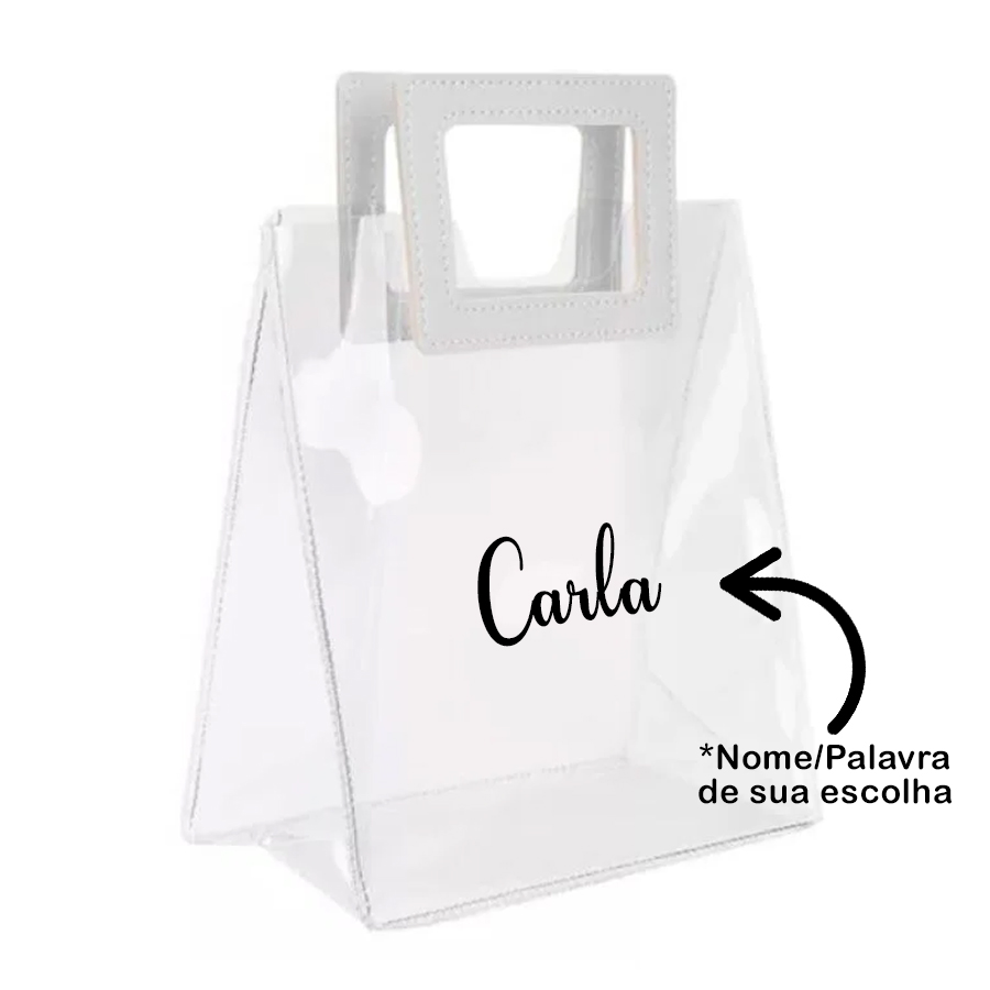 Sacola de plástico transparente com alça tipo couro quadrada, na cor azul, personalizada com nome ou palavra de sua escolha.
