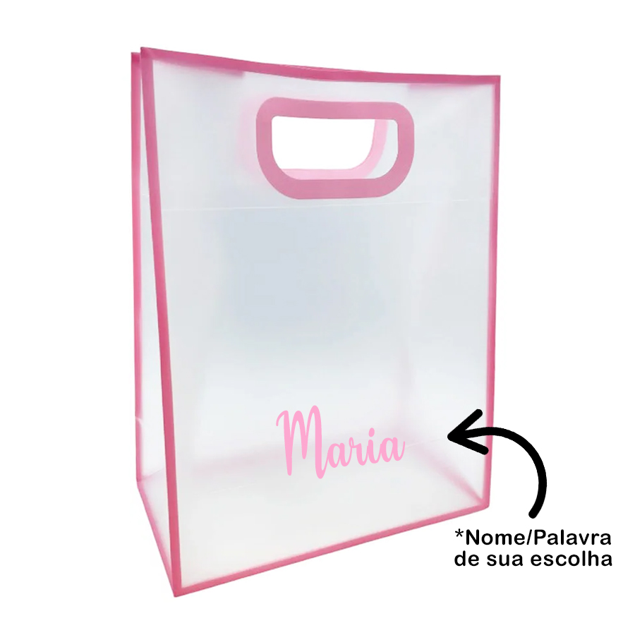 Sacola de plástico transparente com alça, na cor rosa, personalizada com nome ou palavra de sua escolha.