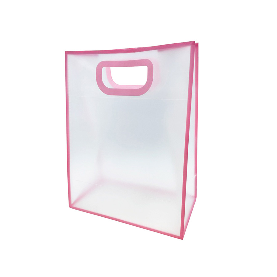 Sacola para presente de PVC, na cor transparente leitoso com bordas e alça embutida na cor rosa.
