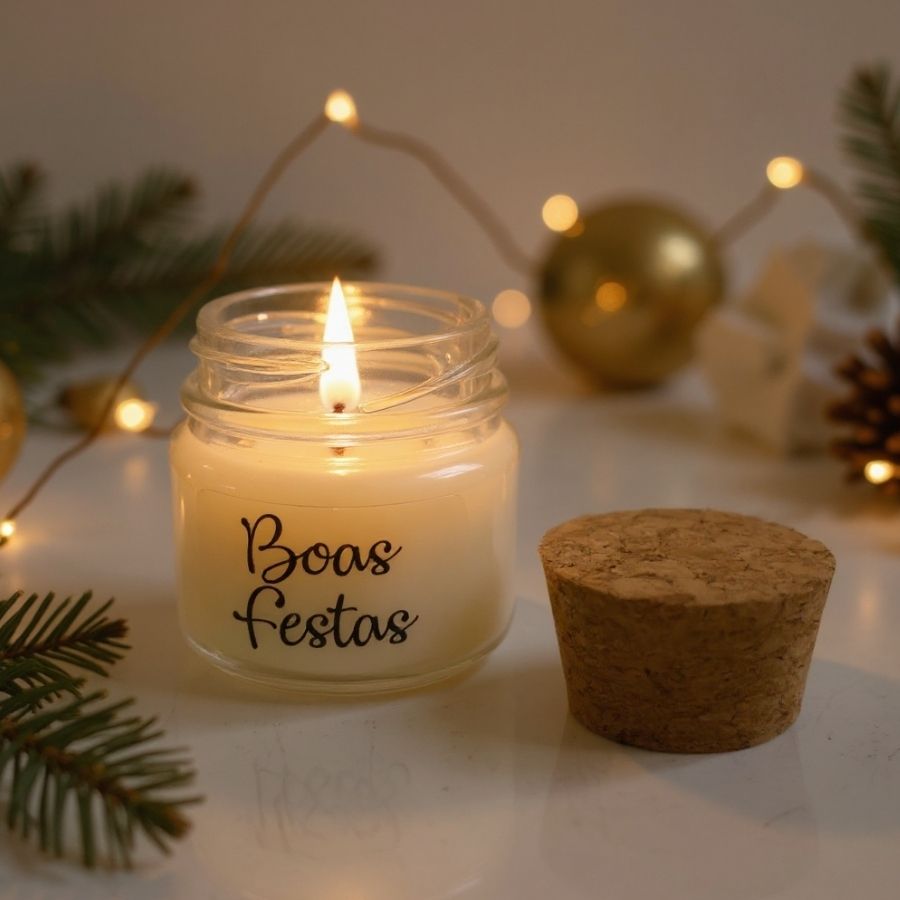 A Vela Aromática De Natal - Boas Festas é um item encantador, perfeito para trazer aroma e clima festivo à decoração de fim de ano. Produzida em pote de vidro com tampa de metal e 40g de cera vegetal, apresenta a frase Boas Festas em lettering elegante, conferindo charme e sofisticação. Ideal para uso em kits de presente, arranjos decorativos e ambientes artesanais, unindo funcionalidade e estilo em uma peça prática e segura.