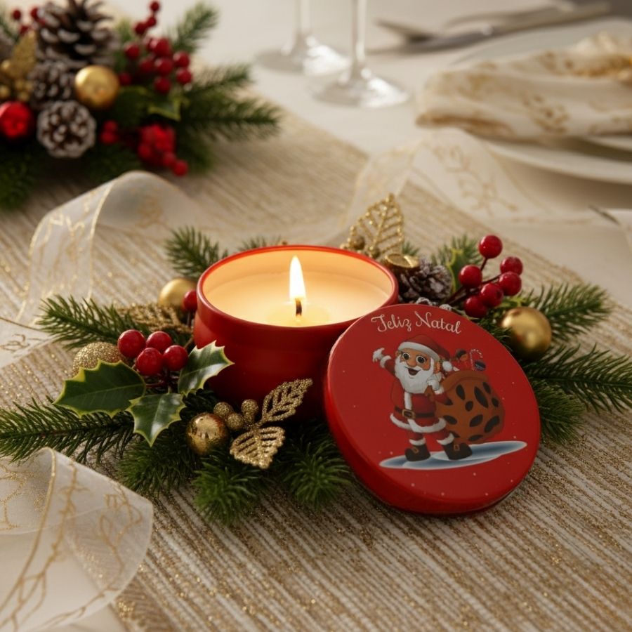 Vela em lata metálica de 70g, perfeita para decorar, aromatizar e presentear durante o Natal, combinando praticidade, segurança e charme.