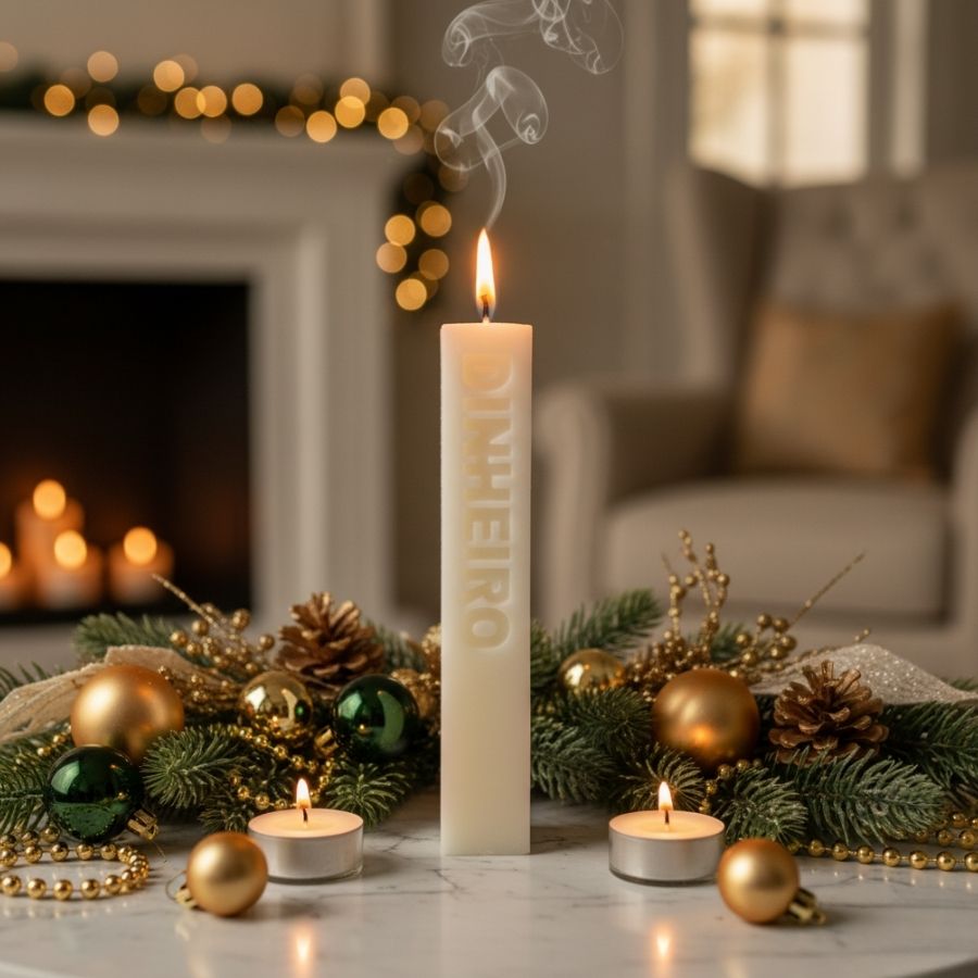 Vela retangular de 15,5cm com palavra “DINHEIRO” em relevo, ideal para decoração, aromaterapia, presentes e projetos artesanais, proporcionando aroma e sofisticação ao ambiente.